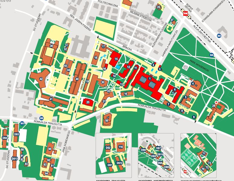 Z lotniska do miejsca sympozjum - budynku Centrum Nanotechnologii A oraz Domów Studenckich nr 4 i 12, (DS4 i DS12 na mapce), można dotrzeć: